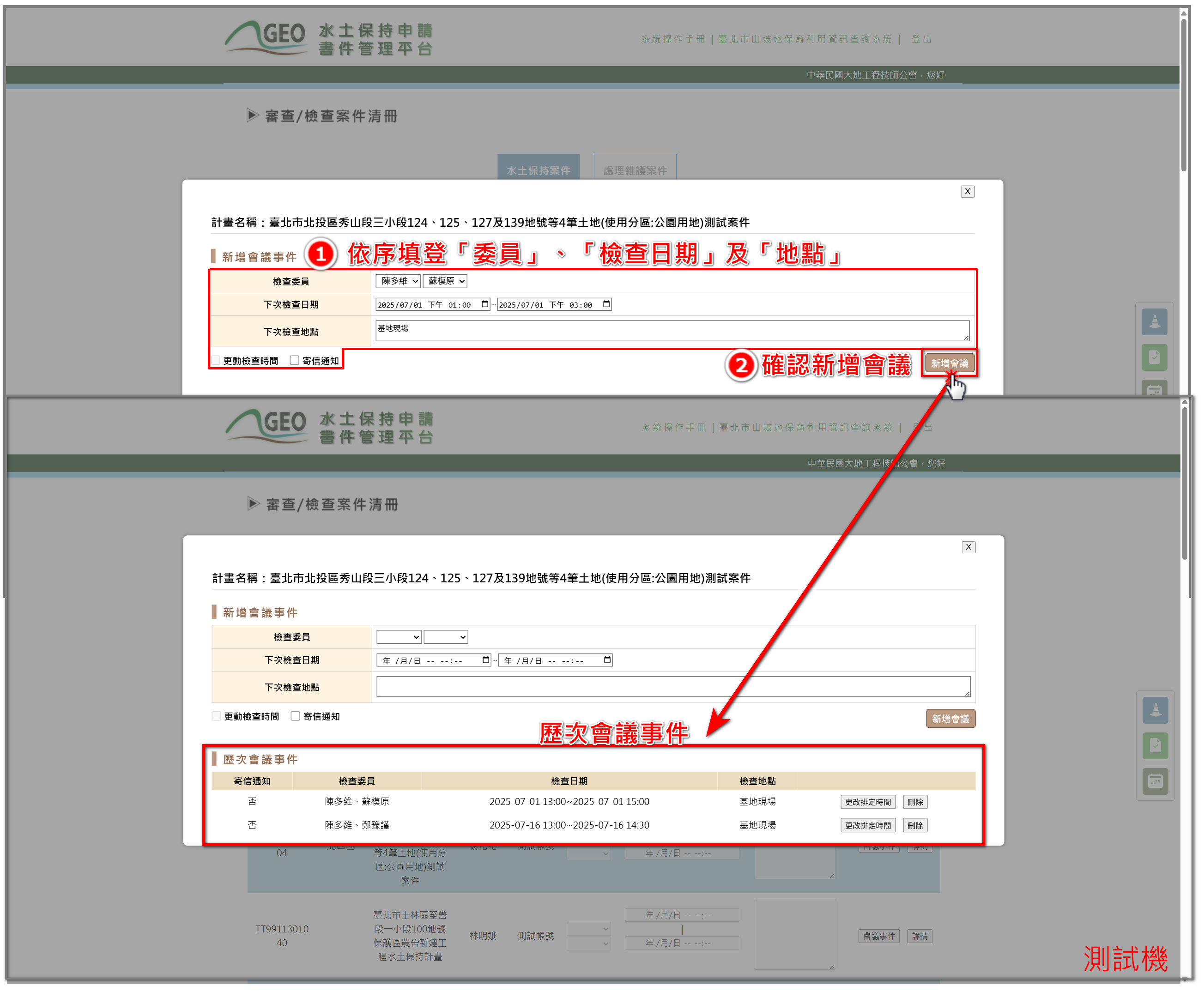 步驟 2.於畫面中依序填寫以下欄位:「檢查委員」、「下次檢查日期」、「下次檢查地點」及「是否寄信通知」,完成填寫後,請確認資料正確,並點選「新增會議」按鈕。 可一次建立多筆事件,系統將於下方歷程中顯示新增的會議事件。 |  |