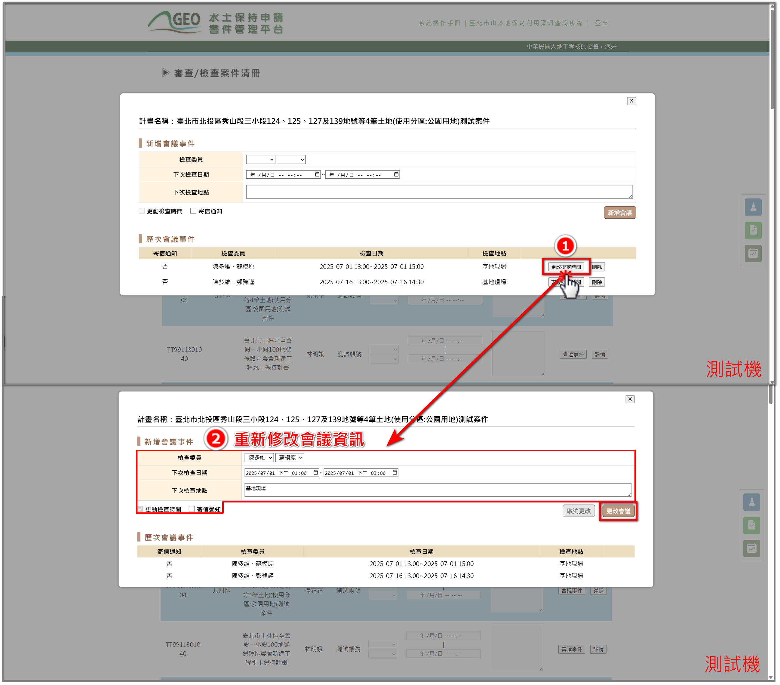 步驟 3.若該筆會議尚未召開且尚未寄出通知,可點選「更改排定時間」按鈕,系統將自動帶入原有資料至編輯欄位,請重新填寫新資訊,修改完成後,請記得按下「更改會議」以儲存此次修改。 |  |